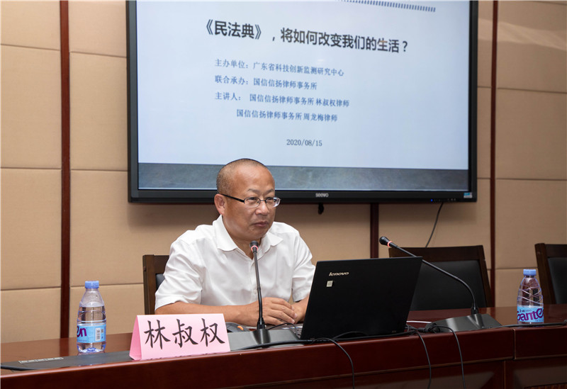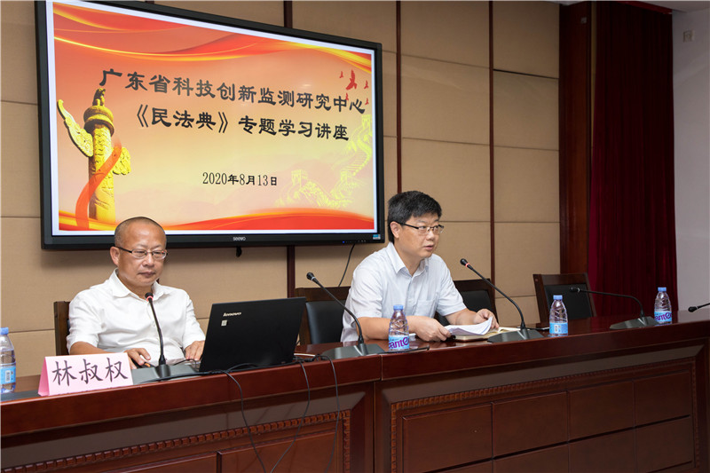 8月14日下午,廣東省科技創(chuàng)新監(jiān)測研究中心于科技廳信息大樓7樓報(bào)告廳舉辦了《民法典》專題解讀學(xué)習(xí)講座。講座邀請廣東省國信信揚(yáng)律師事務(wù)所律師林叔權(quán)、周龍梅作主講嘉賓,中心全體職工參加了本次學(xué)習(xí)。