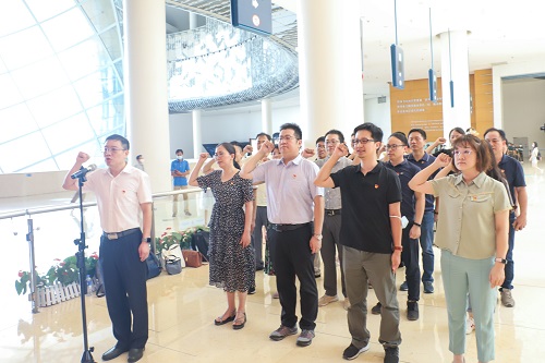 在支部共建交流活動會前,兩個支部的同志在黨旗下重溫了入黨誓詞,參觀了“科創(chuàng)百年——建黨100周年科技成就科普展”,觀看了紅色主題電影《1921》。