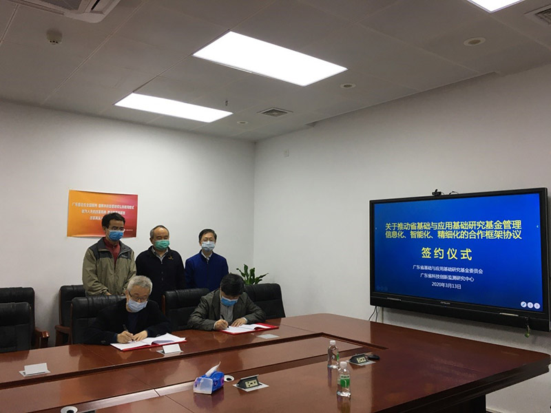 2020年3月13日,生機盎然,萬物舒張,中心與廣東省基礎(chǔ)與應(yīng)用基礎(chǔ)研究委員會(以下簡稱省基金委)在省科技廳大樓3樓簽訂合作框架協(xié)議,組建聯(lián)合工作團隊,共同推進建設(shè)“高效率、智能化”的政務(wù)服務(wù)平臺,推動省基金項目申報、評審立項、執(zhí)行管理、結(jié)題驗收、績效評價、成果管理等全過程的信息化、智能化、精細(xì)化管理,加強數(shù)據(jù)庫建設(shè)和數(shù)據(jù)應(yīng)用服務(wù),促進省基金業(yè)務(wù)管理工作“提質(zhì)增效”,增強省基金資助的導(dǎo)向性、科學(xué)性。